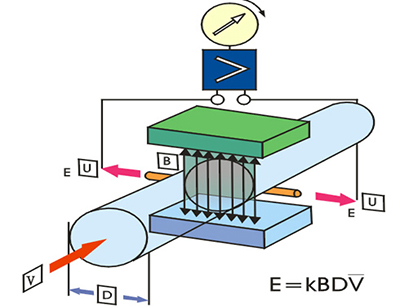 當(dāng)導(dǎo)電液體沿測(cè)量管在交變磁場(chǎng)與磁力線成垂直方向運(yùn)動(dòng)時(shí),導(dǎo)電液體切割磁力線產(chǎn)生感應(yīng)電勢(shì)。在與測(cè)量管軸線和磁力線相互垂直的管壁上安裝了一對(duì)檢測(cè)電*,將這個(gè)感應(yīng)電勢(shì)檢出。