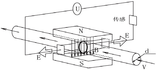 如圖,測量流量時,流體流過垂直于流動方向的磁場,導(dǎo)電性流體的流動感應(yīng)出一個與平均流速成正比的電勢。其感應(yīng)電壓信號通過兩個電*檢出,并通過電纜傳送至轉(zhuǎn)換器,經(jīng)過信號處理及相關(guān)運(yùn)算后,將累計流量和瞬時流量顯示在轉(zhuǎn)換器的顯示屏上。