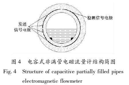 ②電容式非滿管防腐電磁流量計(jì)h。電容式非滿管防腐電磁流量計(jì)結(jié)構(gòu)簡(jiǎn)圖如圖4所示。、檢測(cè)信號(hào)電* 發(fā)送信號(hào)電