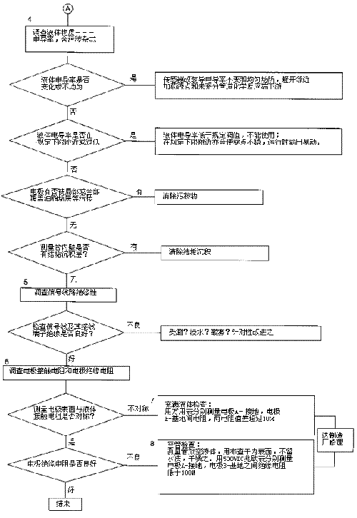 檢查流程圖*5項(xiàng)。信號(hào)回路絕緣下降會(huì)形成零點(diǎn)不穩(wěn)。信號(hào)回路絕緣下降的土要原因足,包*部位絕緣下降所引起的,但也不能排除信號(hào)電纜及其接線端子絕緣下降或破壞。因?yàn)橛袝r(shí)候現(xiàn)場環(huán)境十分嚴(yán)酷,稍一疏忽儀表蓋、導(dǎo)線連接處密封不慎,彌漫著潮氣酸霧或粉粒塵埃侵入儀表接線盒或電纜保護(hù)層,使絕緣卜降。信號(hào)回路絕緣電阻檢查分別按電纜側(cè)和流量傳感器側(cè)兩郵分進(jìn)行,用兆歐表測試。因信號(hào)電纜容易可先做。流量傳感器再分兩次進(jìn)行:充滿液體測黽電*表面接觸電阻和個(gè)管后測量,U*絕緣電阻。