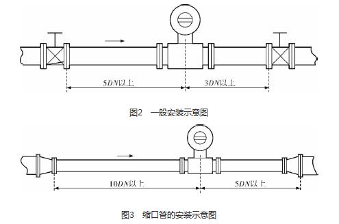 砂漿流量表的安裝質(zhì)量對(duì)其測(cè)量結(jié)果的影響較大,因此在安裝時(shí)需要注意幾個(gè)問題。*先,砂漿流量表直管段的選擇在配管時(shí)一定要按照要求進(jìn)行選擇,一般選擇流量計(jì)通徑與工藝管道通徑相同,即可滿足工程需要,而且安裝方便、壓力損失小,流量計(jì)直管段上游側(cè)的長(zhǎng)度不少于5倍工藝管道直徑,下游側(cè)的長(zhǎng)度不少于3倍工藝管道直徑(圖2)。但在流速太慢而又要求精度較高或需要變徑的應(yīng)用場(chǎng)合,可選擇通徑小于工藝管道通徑的流量計(jì),以提高測(cè)量精度,此時(shí)流量計(jì)上、下游必須加裝異徑管,且進(jìn)口異徑管上游側(cè)應(yīng)有長(zhǎng)于10倍工藝管道直徑的直管段,下游側(cè)應(yīng)有長(zhǎng)于5倍工藝管道直徑的直管段(圖3)。