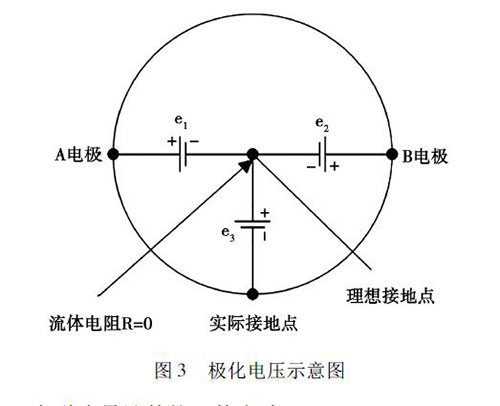 在被測液體與電*和接液部件接觸過程中,電解質(zhì)中的正負(fù)離子會分別作定向運(yùn)動,這會使被測液體在電*和接液部件之間形成電位差,通常將這種現(xiàn)象稱為*化現(xiàn)象。如圖3 所示,理論上來說,兩電*A 和B 對接液部件的電位e1、e2大小相等、方向相反,此時(shí)兩電*的電位差等于零。但是,若兩電*的材質(zhì)或表面狀態(tài)存在差異,此時(shí)A、B 電*之間的電位差就不為零,這就形成了*化電壓,*化電壓與共模狀態(tài)的電壓e3一起疊加在流量信號中,被輸入轉(zhuǎn)換器的差動放大器。當(dāng)*化電壓過大,則會對差動放大器的輸入端造成較大影響,導(dǎo)致信號無法放大或流量信號的輸出波動過大,從而降低了丙酸流量計(jì)的測量精度。