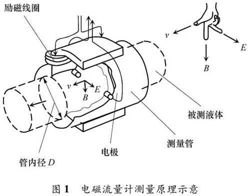 一體式污水流量表的測量原理如圖 1 所示。根據(jù)法拉*電磁感應(yīng)定律,導(dǎo)電液體在磁場中流動會產(chǎn)生電動勢 E,它與磁感應(yīng)強度 B、導(dǎo)電液體平均流速 v 成一定比例關(guān)系: