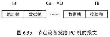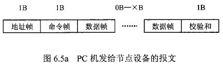 在硫酸流量表等節(jié)點設(shè)備和C機通信的過程中,由地址幀、命令幀、數(shù)據(jù)幀、校驗和可組成各種功能不同的報文。由于采用主從工作方式來實現(xiàn)通信,硫酸流量表等節(jié)點設(shè)備僅能接收并執(zhí)行PC機發(fā)送來的控制命令,而不能發(fā)送命令給PC機。因此,由PC機發(fā)往流量計等節(jié)點設(shè)備的報文一般包括一個地址幀,一個命令幀,若干個數(shù)據(jù)幀和一個校驗和,其報文格式圖.6a5所示;而由流量計等節(jié)點設(shè)備發(fā)往PC機的報文一般包括一個地址幀,若干個數(shù)據(jù)幀和一個校驗和,其報文格式如圖6.5b所示。