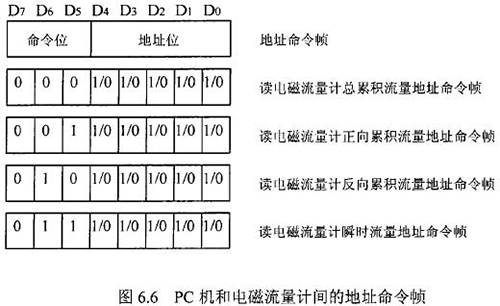 由于RS一485電氣標準規(guī)定每段只能聯(lián)結(jié)犯個節(jié)點設(shè)備,因此可用地址幀中五個二進制位表示這32個地址,其余3位用來表示命令,從而構(gòu)成地址命令幀。對于控制命令需求不超過八個的通信系統(tǒng),采用地址命令幀可壓縮報文長度提高通信效率。在污水網(wǎng)絡(luò)監(jiān)控系統(tǒng)中,硫酸流量表和PC機通信的主要目的是將流量計中的有用數(shù)據(jù)讀到PC機中。這些數(shù)據(jù)包括:總累積流量、正向累積流量、反向累積流量、瞬時流量。通信時,PC機只需向硫酸流量表發(fā)送讀總累積流量、讀正向累積流量、讀反向累積流量、讀瞬時流量命令即可,因此二者間通信所用的地址幀和命令幀可合二為一,用一個地址命令幀代替。PC機和硫酸流量表間的地址命令幀定義如圖.66所示。根據(jù)污水網(wǎng)絡(luò)監(jiān)控系統(tǒng)中PC機與硫酸流量表間通信的特殊性,二者通信所使用的報文可簡化為圖.67的格式。