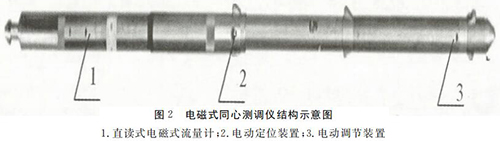 電磁式同心測調(diào)儀是同心分層注水工藝技術(shù)的關(guān)鍵儀器,其設(shè)計理念:集成流量測試與水量調(diào)節(jié)于一體,實現(xiàn)測調(diào)同 步;動力傳遞設(shè)計為同心降速機制,機械結(jié)構(gòu)簡單,動力傳遞效率高,測調(diào)穩(wěn)定性高。主要包括以下結(jié)構(gòu),如圖2所示。