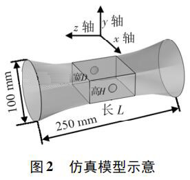 使用 Pro /E 軟件建立三維幾何模型,導(dǎo)入 COMSOL 軟件進行有限元求解。仿真模型如圖 2 所示,電*連線為x 軸,連線中點為坐標(biāo)原點,流體運動方向為 z 軸,傳感器管道口徑為 DN100,總長250 mm。異徑管部分初始結(jié)構(gòu)尺寸 L = 80 mm,D = 80 mm,H = 40 mm,圓形電*半徑為17 mm,伸出絕緣襯里的*大距離為 1. 5 mm。
