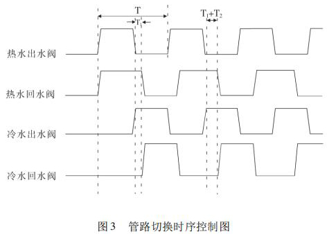 開始試驗,冷熱水箱預(yù)先達到試驗要求溫度,水泵運轉(zhuǎn)調(diào)節(jié)管路流量至設(shè)定值。系統(tǒng)給定信號控制四個開關(guān)閥(熱水出水閥、熱水回水閥、冷水出水閥、冷水回水閥) 的打開與關(guān)閉,實現(xiàn)冷熱水的切換。熱水沖擊時,熱水出水閥與熱水回水閥打開的同時,冷水出水閥與冷水回水閥關(guān)閉,確保試驗管路熱水沖擊;同理,冷水沖擊時,冷水出水閥與冷水回水閥打開,熱水出水閥與熱水回水閥關(guān)閉,確保試驗管路冷水沖擊。系統(tǒng)通過四個開關(guān)閥對管路進行時序控制,達到管路切換的目的,很好地實現(xiàn)了 4000次冷熱循環(huán)沖擊試驗。其具體的管路切換控制時序圖如圖 3 所示。