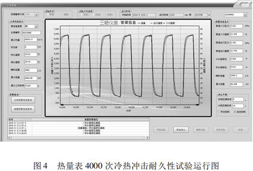 本文研究的 4000 次冷熱沖擊試驗的實現(xiàn)具有以下特點: (1)基于“工控機 +水泵 + 分體式污水流量表”的閉環(huán)控制系統(tǒng),實現(xiàn)了流量自動反饋調(diào)節(jié),滿足試驗要求; (2)通過四個開關(guān)閥的時序切換,自動控制試驗溫度,很好的完成了 4000 次溫度沖擊試驗; (3)通過“工控機 + 數(shù)據(jù)數(shù)據(jù)采集卡”的數(shù)據(jù)采集系統(tǒng),實時監(jiān)控試驗過程中的流量、溫度、壓力等相關(guān)參數(shù),實現(xiàn)試驗方式的自動控制,并能對試驗數(shù)據(jù)進行分析與評定。 (4)試驗的全過程為智能自動化,可無人員留守看護。試驗結(jié)果可直接反映出熱量表在長時間運行后的可靠性。為我國熱量表耐久性試驗研究提供檢測手段,為促進產(chǎn)品質(zhì)量提升做好技術(shù)保障。