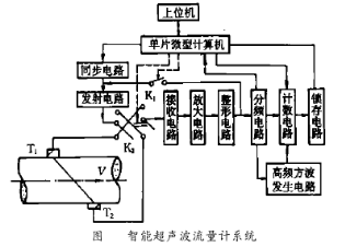 智能超聲波流量計的系統(tǒng)結(jié)構(gòu)如圖2所示。其工作過程是:在上位機(jī)的控制下,單片機(jī)先對計數(shù)器清零,使開關(guān)K1閉合,K2合向下邊,然后控制同步電路發(fā)出同步啟動脈沖,觸發(fā)超聲波換能器T1發(fā)射*1個超聲脈沖波,同時使計數(shù)電路開始對周期為f的高頻方波進(jìn)行計數(shù)。該超聲脈沖順流傳播,至T2處被接收并轉(zhuǎn)換成電信號,經(jīng)過放大、整型,一部分返回代替同步信號觸發(fā)T1再次發(fā)射超聲波,如此反復(fù)形成順流發(fā)射聲循環(huán),另一部分進(jìn)入分頻電路進(jìn)行分頻。當(dāng)聲循環(huán)M次,分頻器滿并產(chǎn)生一信號,關(guān)斷高頻方波,使計數(shù)停止計數(shù)。同時單片機(jī)斷開K1停止聲循環(huán),讀取鎖存器中的順流發(fā)射聲循環(huán)計數(shù)值N1。然后單片機(jī)再對計數(shù)器清零,再使開關(guān)K1閉合,K2 合向上邊,觸發(fā)換能器T2 發(fā)射。此次,T2 發(fā)射T1接收,形成逆流發(fā)射聲循環(huán),同樣可得到逆流發(fā)射聲循環(huán)計數(shù)值N2。當(dāng)聲循環(huán)次數(shù)M足夠大,由于統(tǒng)計作用,上述2次聲循環(huán)的固有電聲延遲 (包括超聲波經(jīng)過換能器透聲斜楔、管圖2智能超聲波流量計系統(tǒng)壁等所需的時間以及電信號滯后的時間)之和是相等的,于是當(dāng)f已知且固定不變時,根據(jù)上述公式可將2個計數(shù)值之差 (N2 -N1)換算成流體流速V和流量Q。